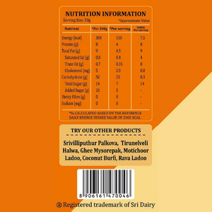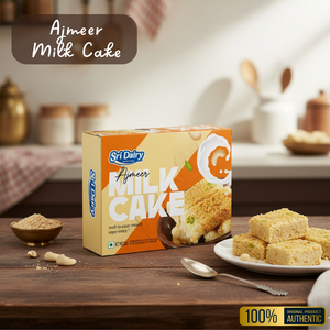 Ajmer Milk Cake, also called Ajmeri Kalakand, comes from the city of Ajmer in Rajasthan. At Sri Dairy, we work with expert sweet makers from Rajasthan to create the real taste of this special dessert. We use fresh milk from country breed cows in nearby villages and cook it slowly on low heat. This slow cooking makes the sugar caramelize naturally, giving the milk cake its perfect golden color and rich flavor.