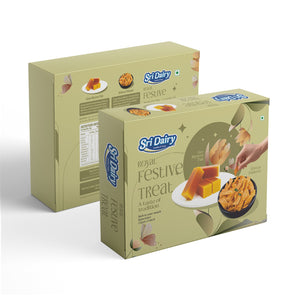 Celebrate Royalty: Indulge in the rich taste of our Festive Treat Royal, a delightful pairing of melt-in-mouth Ghee Mysore Pak and crispy Ribbon Pakoda, crafted to bring balance and joy to every festive moment.