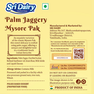 Indulge in the rich, traditional taste of Palm Jaggery Mysore Pak (Karuppatti Mysore Pak) from Sri Dairy, made with authentic palm jaggery sourced from trusted farmers. Prepared using time-honoured methods, our palm jaggery syrup enhances the natural sweetness and depth of this classic dessert. Enjoy a healthier twist on Mysore Pak, free from refined sugar, and packed with earthy Flavors. Order your Palm Jaggery Mysore Pak online today and savor a piece of South Indian heritage. Perfect for gifting or relishing as a guilt-free treat!