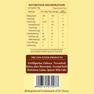Indulge in the rich, traditional taste of Palm Jaggery Mysore Pak (Karuppatti Mysore Pak) from Sri Dairy, made with authentic palm jaggery sourced from trusted farmers. Prepared using time-honoured methods, our palm jaggery syrup enhances the natural sweetness and depth of this classic dessert. Enjoy a healthier twist on Mysore Pak, free from refined sugar, and packed with earthy Flavors.